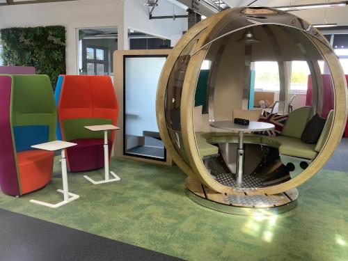 One area utilised a Rotating lounger as a central flexible feature in the office with a seat box unit for video conferencing and private working. We also introduced colourful bespoke lockers and acoustic Nomad screens for existing desks.