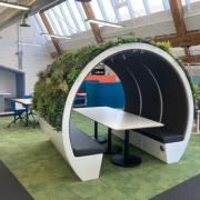 In space 2 we installed a 6 person open meeting pod with bespoke green covering to create some central interest with flexible meeting space. We also instroduced soft seating, a Nook pod and a Hush Twin pod for cost effective video conference space. Morph walls were used with an acoustic covering to help divide space and create more private areas.